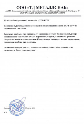 Актуальный сертификат на всю выпускаемую продукцию под брендом ТЕК-КОМ. Данный сертификат позволяет поставлять продукцию на ОЕМ производства.