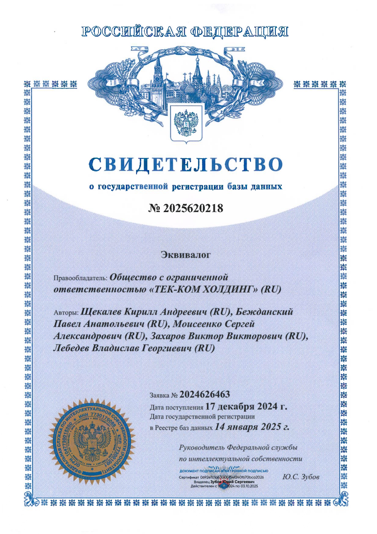 Результат нашей работы — интеллектуальная собственность ГК ТЕК-КОМ, которая защищена патентами и авторскими свидетельствами (два патента и два свидетельства на ПО и БД Эквивалог).