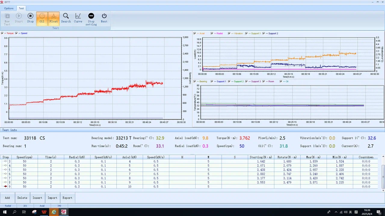 ТЕК-КОМ имеет уникальную машину, спроектированную по собственному техническому заданию, позволяющую снимать характеристики момента трения подшипников качения с наружным диаметром до 200 мм. Испытания могут проводиться как по собственным методикам ТЕК-КОМ, так и модифицированным — согласно требованиям заказчиков. Результат испытаний — характеристики момента трения подшипников качения в зависимости от осевой нагрузки или частоты вращения. Данное испытание позволяет оперативно сравнить технический уровень подшипников качения, способных воспринимать осевые нагрузки от различных изготовителей и разной внутренней конструкции.